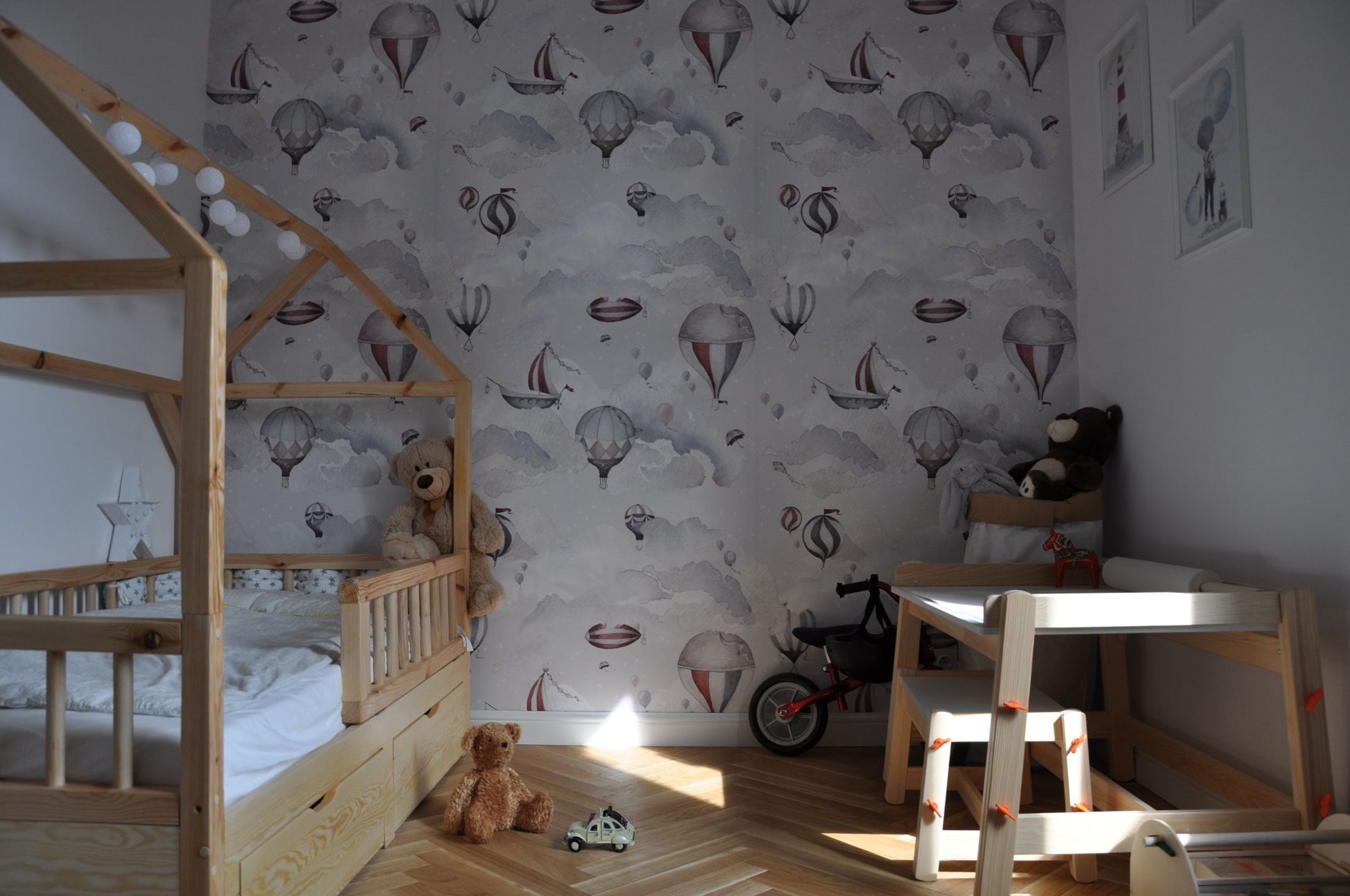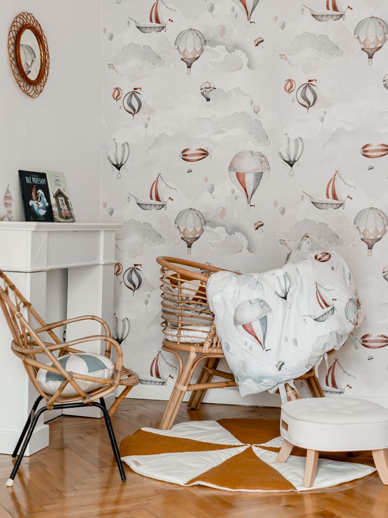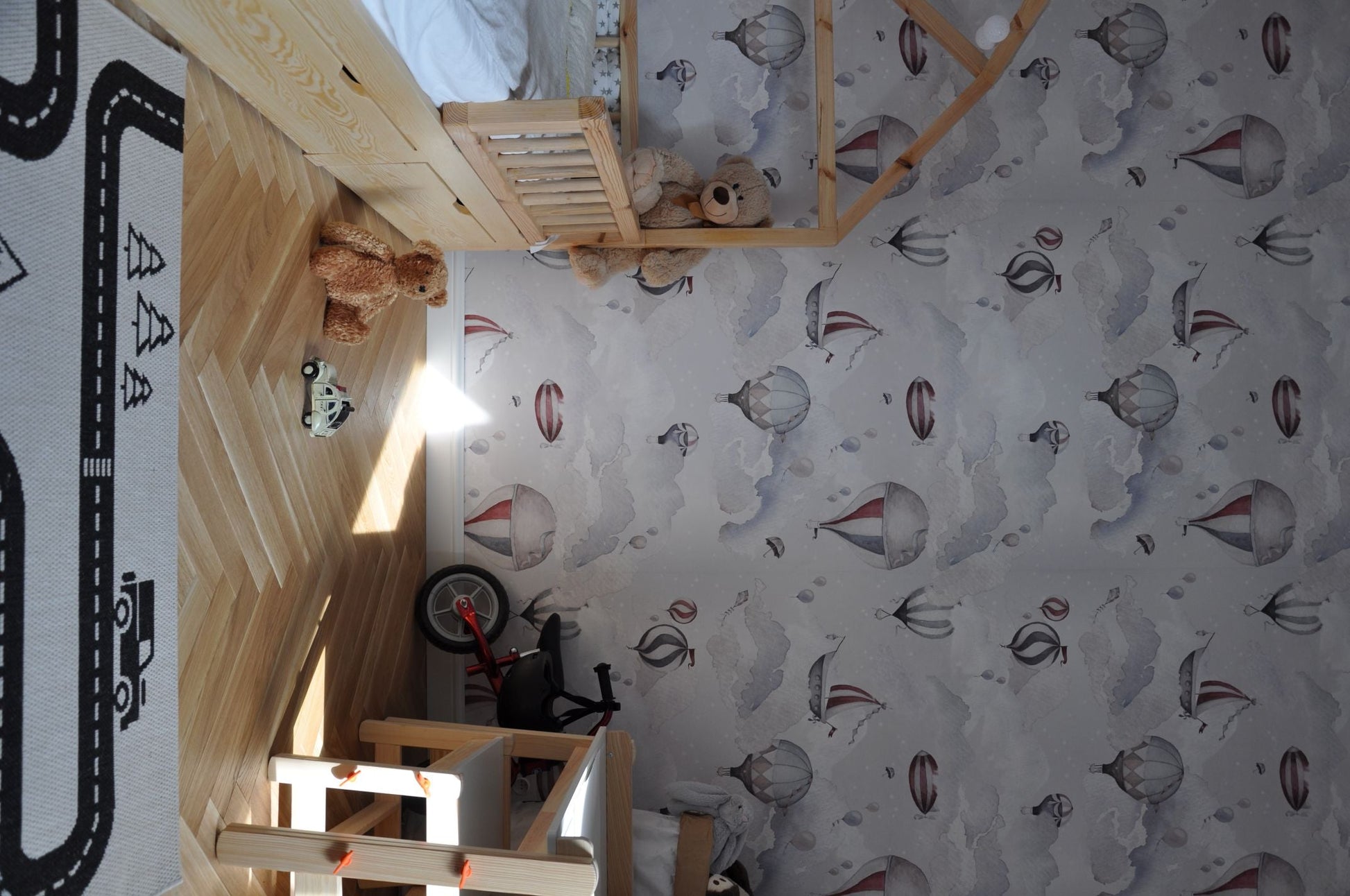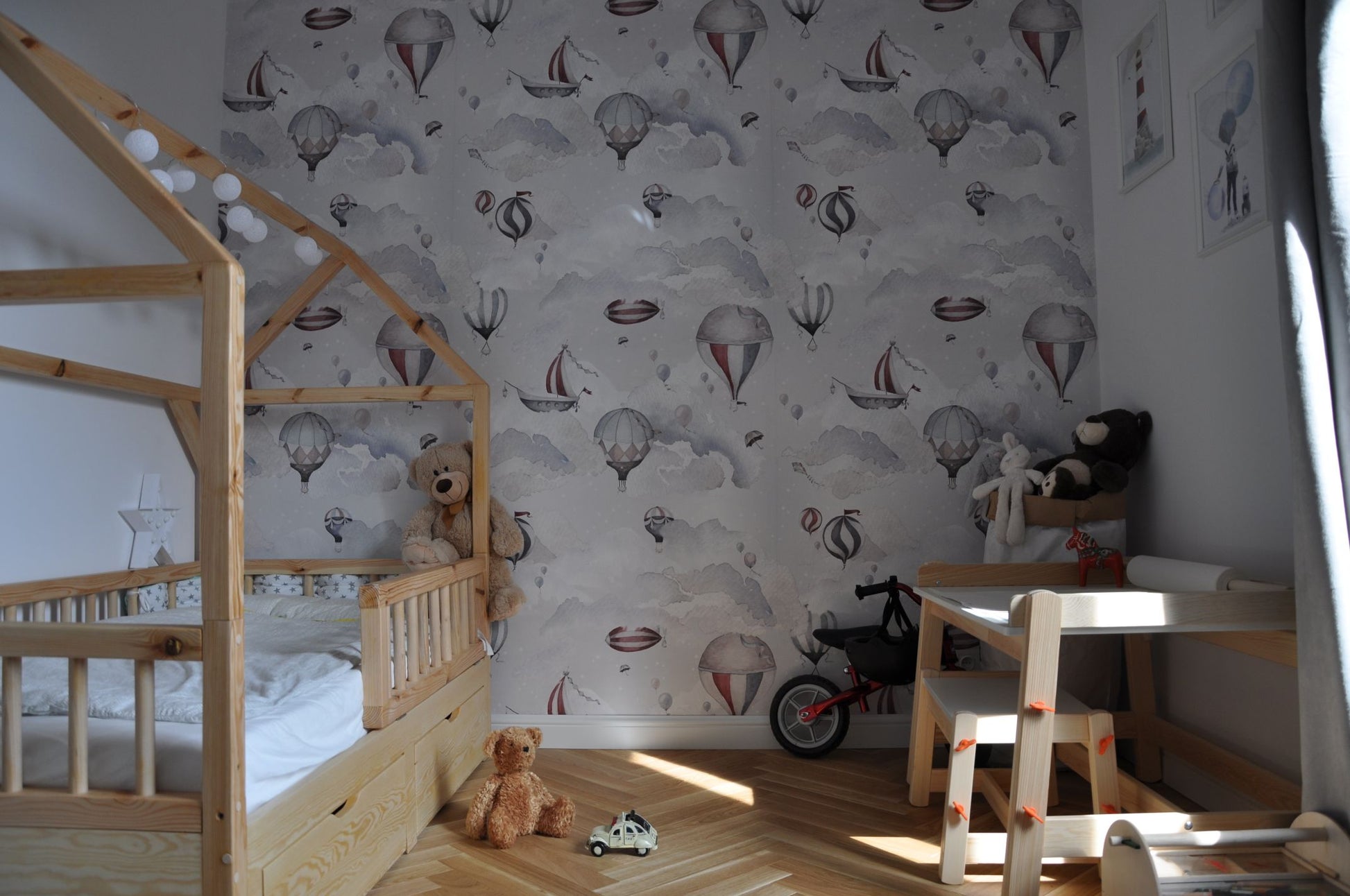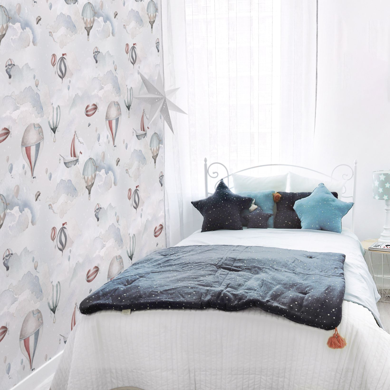 If you want your baby to have beautiful dreams then this wallpaper is a perfect choice… Pure magic and dreams of travelling and discoveries guaranteed: balloons, airships, kites and ships with blue balloons between them. They all float in the calm sky in search of adventures. The elements on the wallpaper are from 10 cm to 35 cm in size and are in shades of blue so that the wallpaper perfectly suits baby rooms with white cradles and natural wooden furniture.