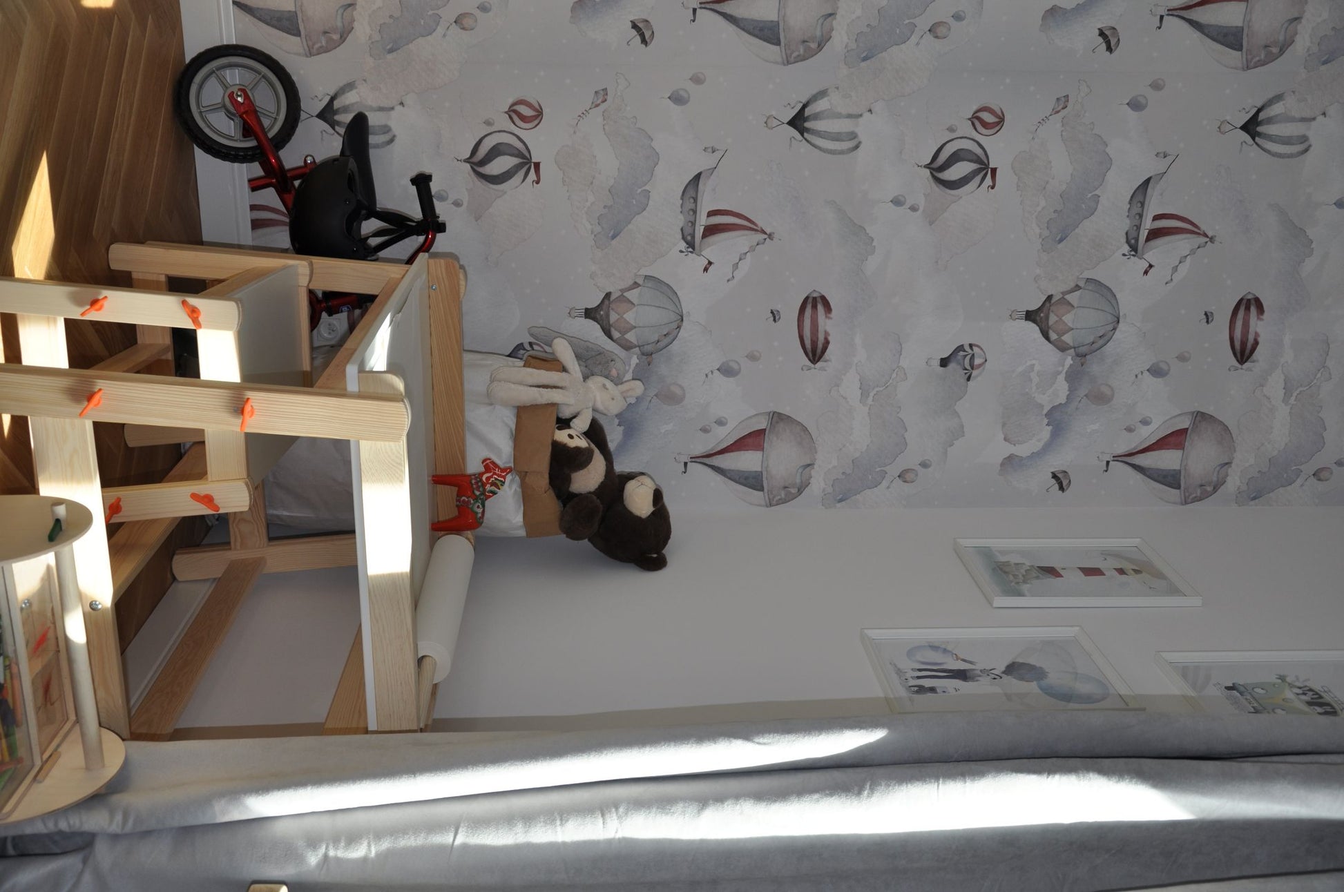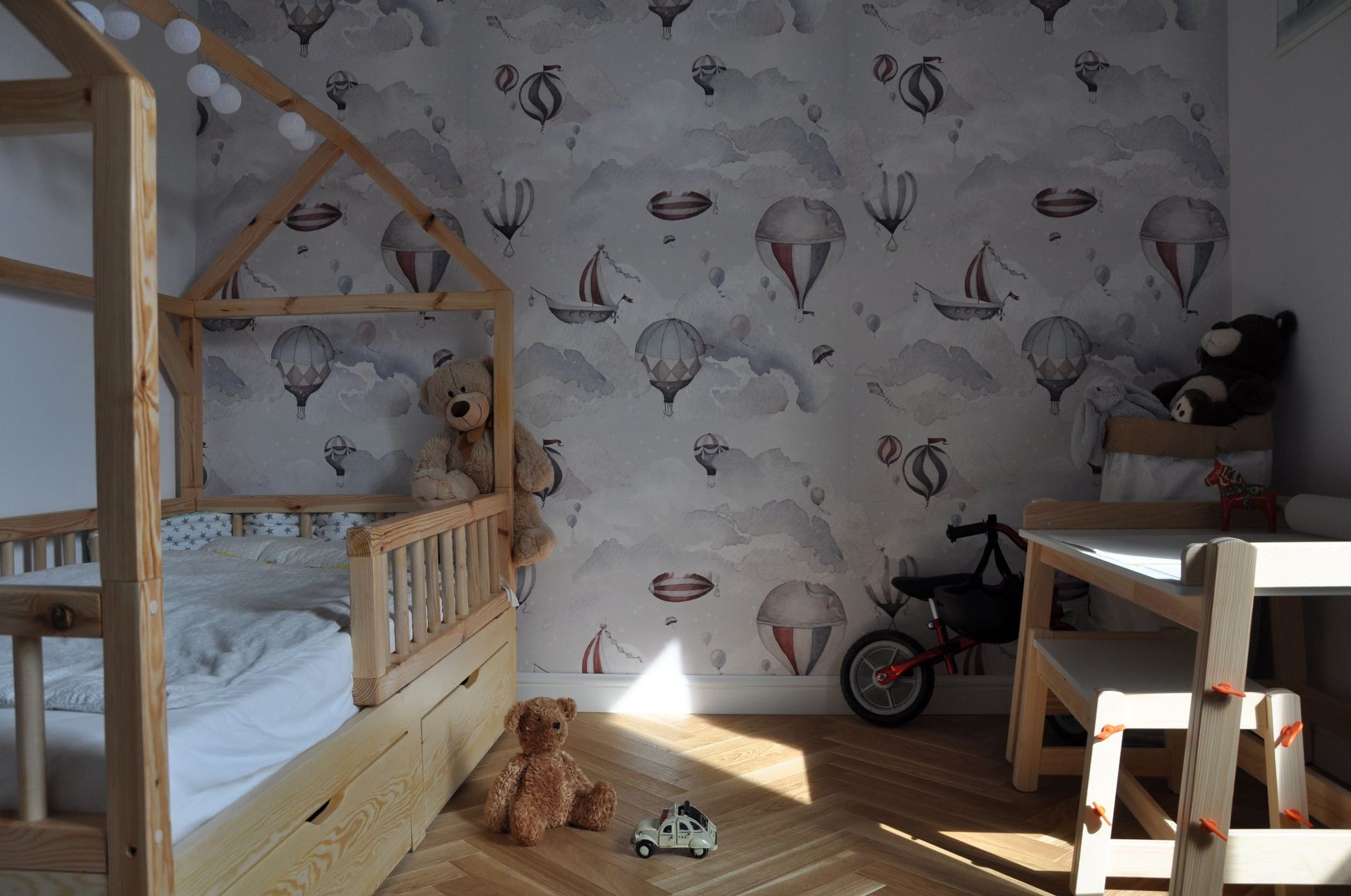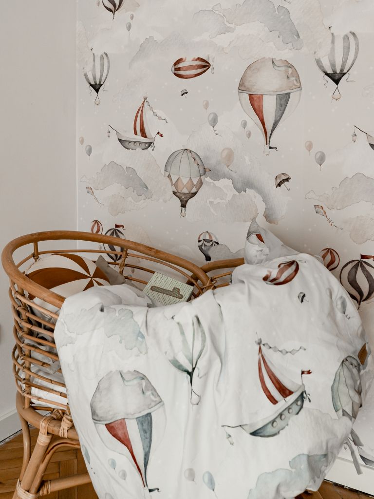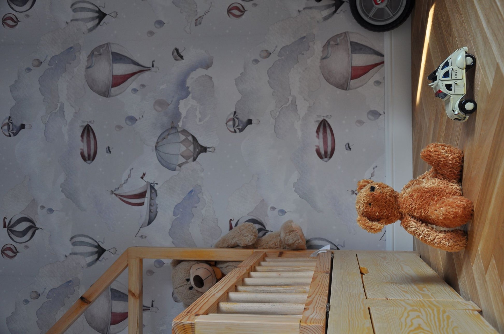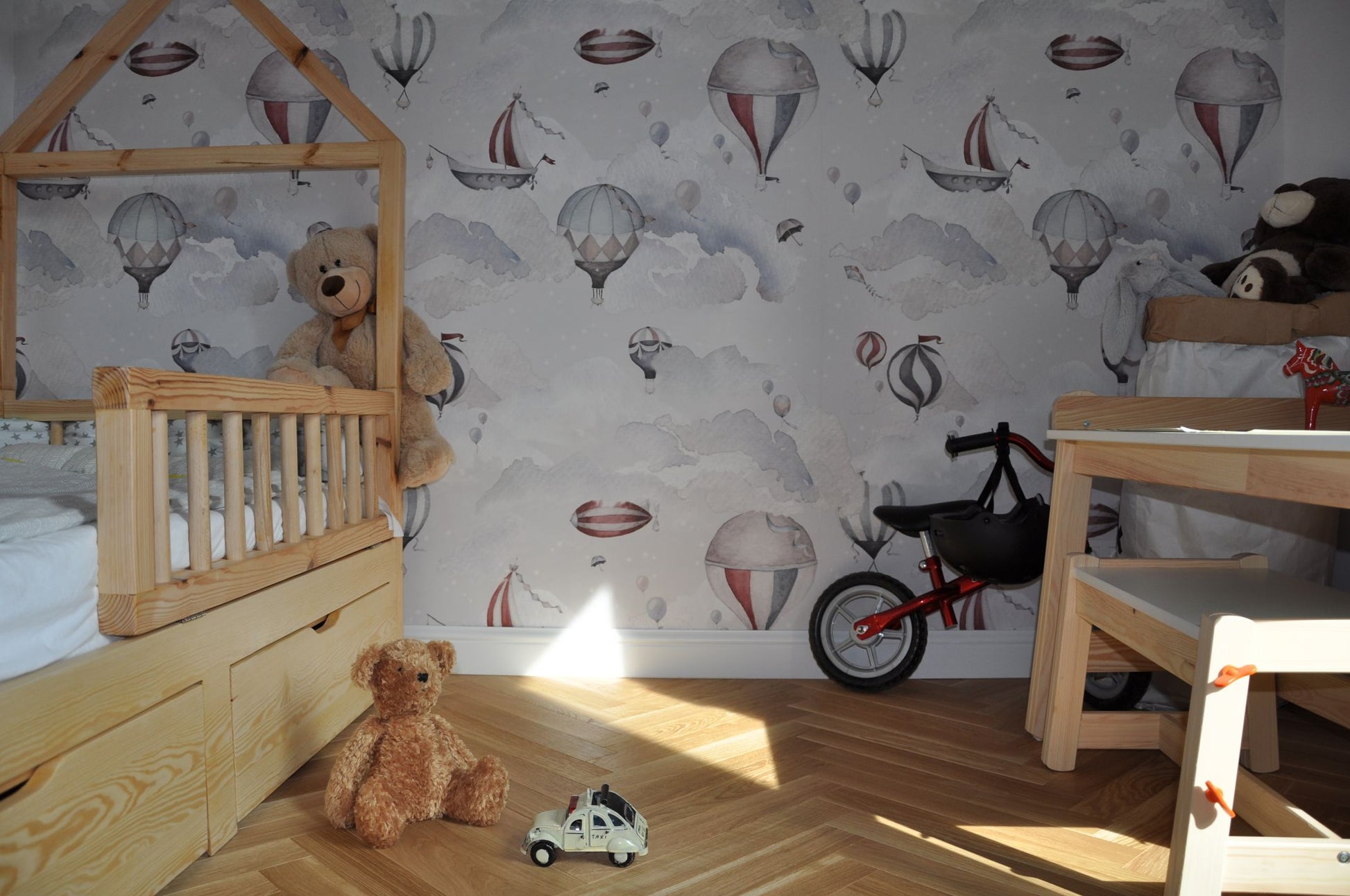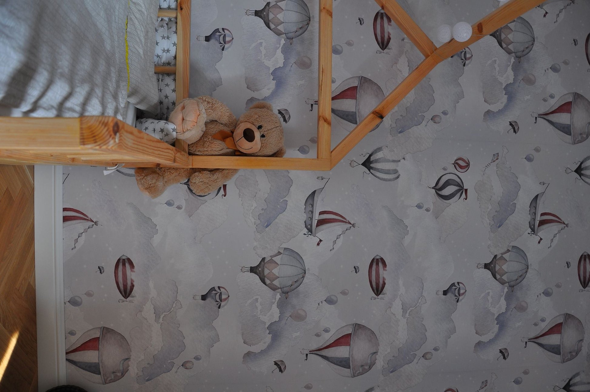 If you want your baby to have beautiful dreams then this wallpaper is a perfect choice… Pure magic and dreams of travelling and discoveries guaranteed: balloons, airships, kites and ships with blue balloons between them. They all float in the calm sky in search of adventures. The elements on the wallpaper are from 10 cm to 35 cm in size and are in shades of blue so that the wallpaper perfectly suits baby rooms with white cradles and natural wooden furniture.
