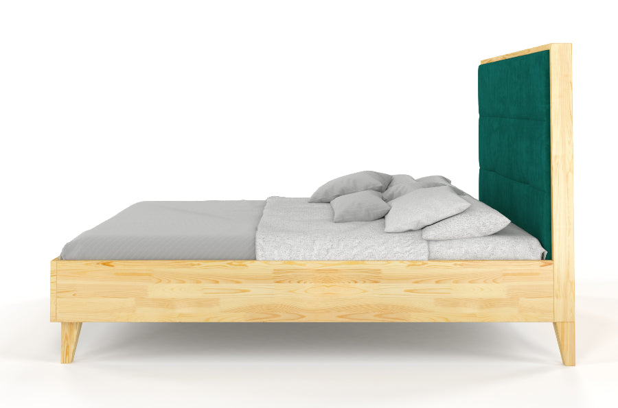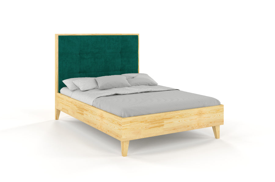 FRIDA wooden pine bed was designed for people who value resting in bed also during the day. FRIDA is a very elegant piece of furniture. It has a high headrest with a thick wooden frame, which the front part was upholstered with a velour fabric pleasant to the touch. The upholstery is quilted in the shape of rectangles. On the headrest, you can lean on the pillow and enjoy reading books or watching TV, even for a long time. Important is the fact that despite the high headrest (130 cm) its construction is very strong and stable.