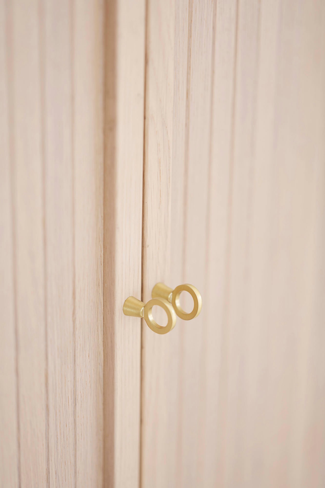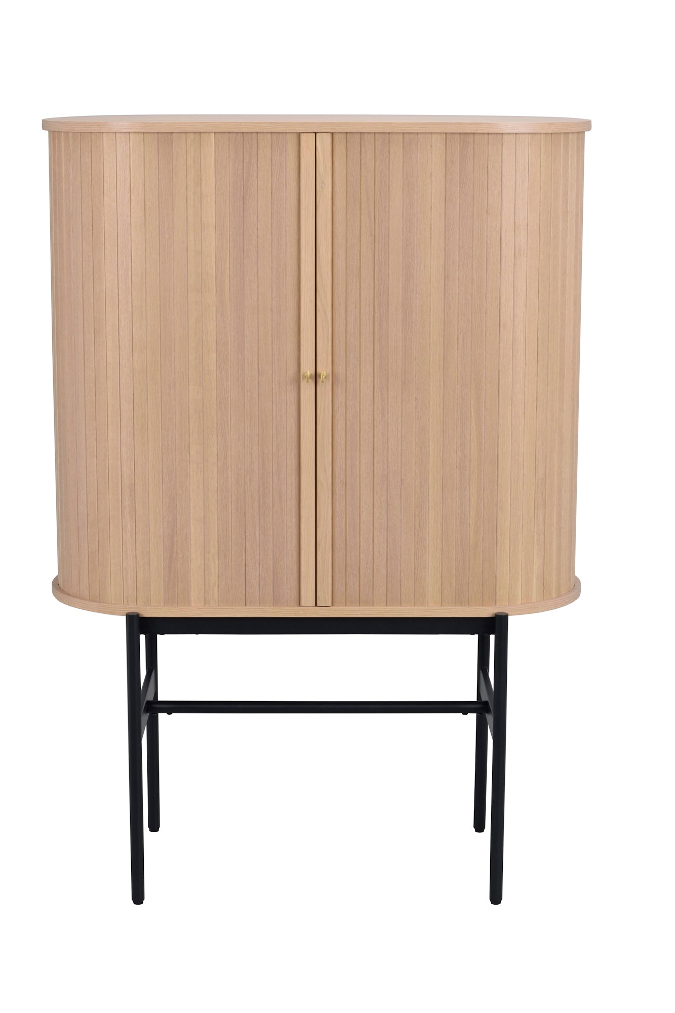 Haddington cabinet, with its oval shape, sliding shutter doors, and brass-coloured knobs is a stylish and trendy storage unit. The high legs of black powder-coated metal give the room a nice feeling. The Haddington series also includes a cabinet and console table.