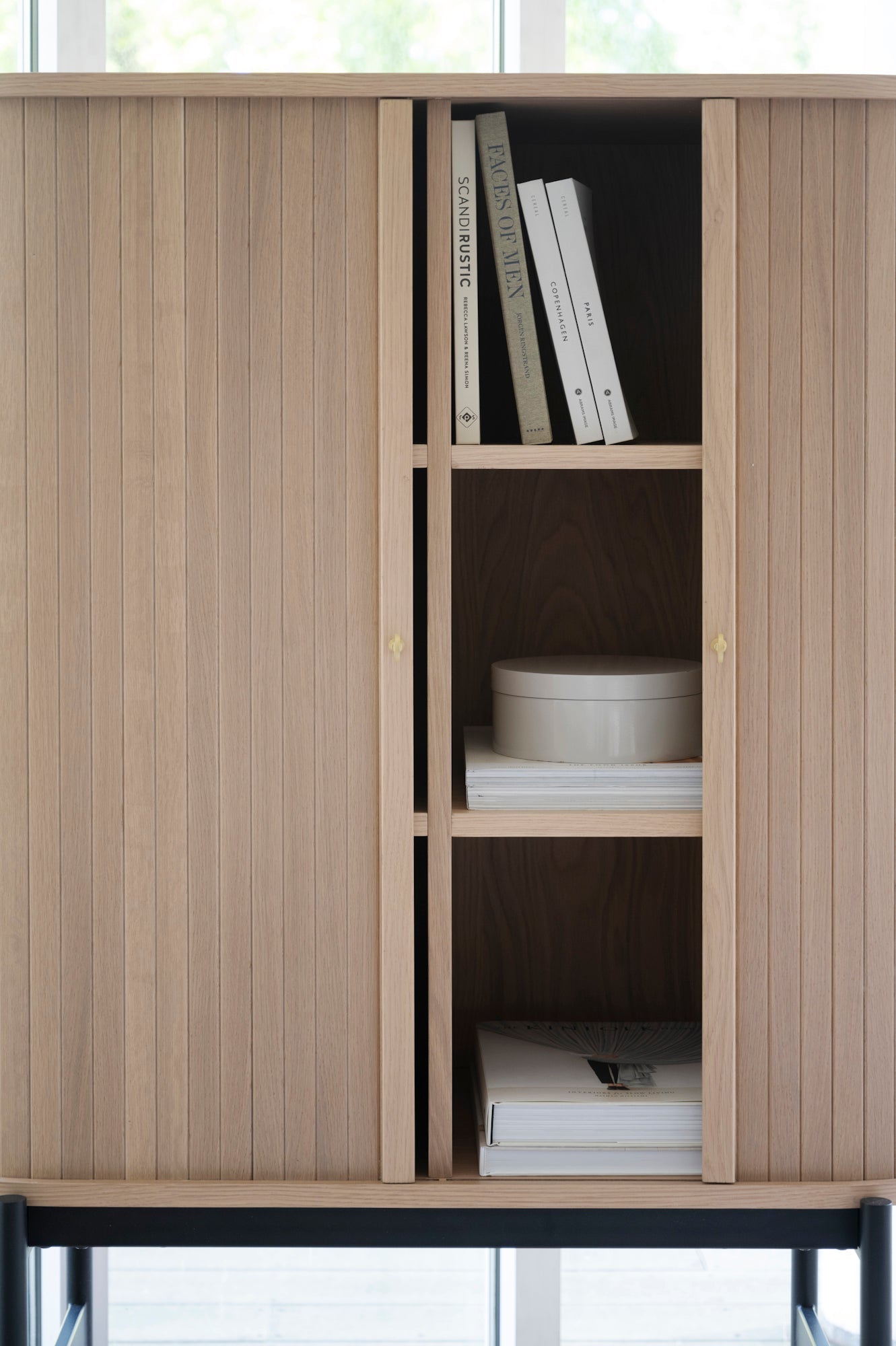 MDF with oak veneer, solid oak in details like the stripes on drawers. Powder-coated metal base in sand structure.