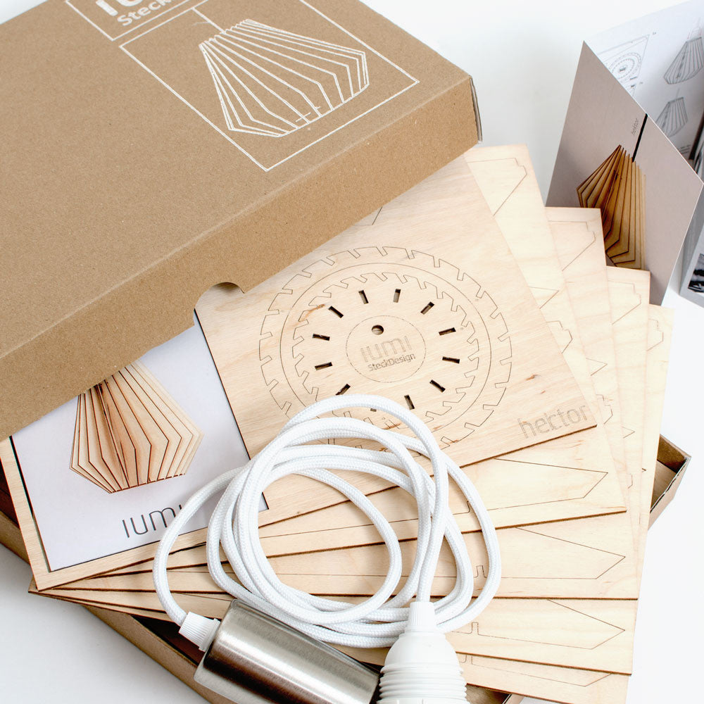 IUMI lights are shipped in a beautifully hand printed box as assembly kits. No need for screws or glue as the precision cut pieces simply slot together. An illustrated assembly manual is included.