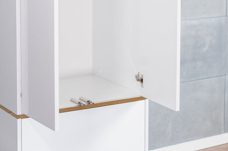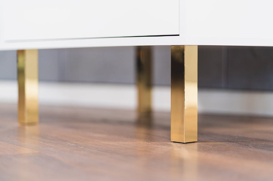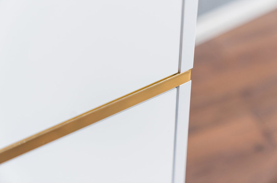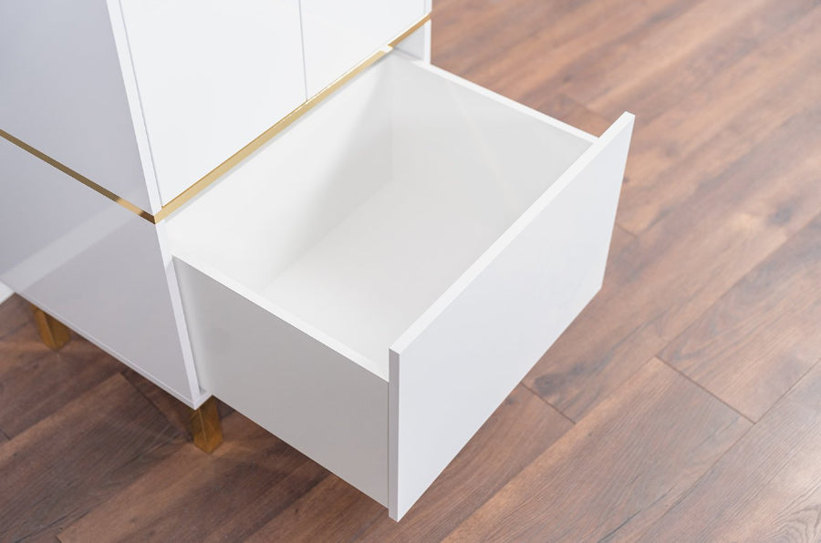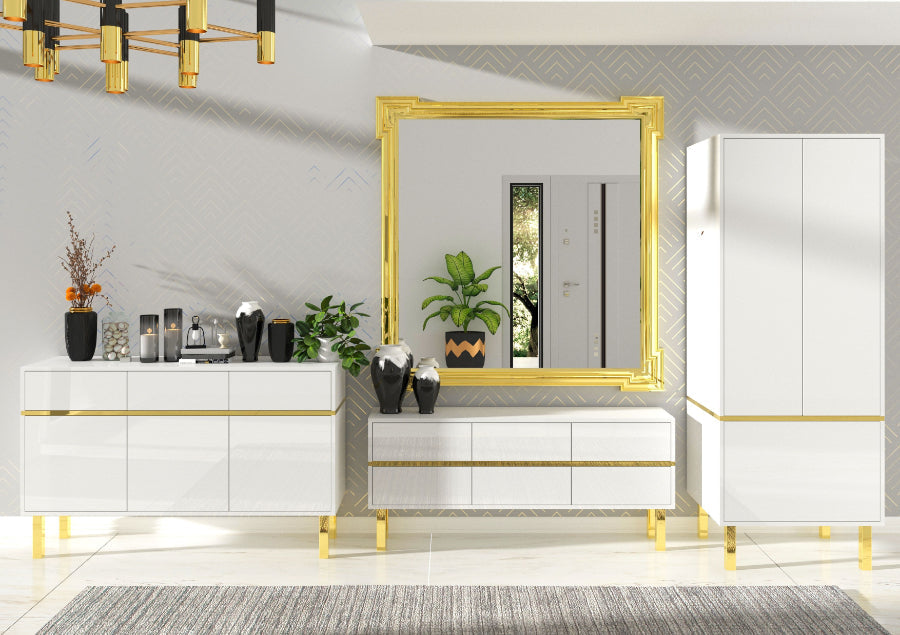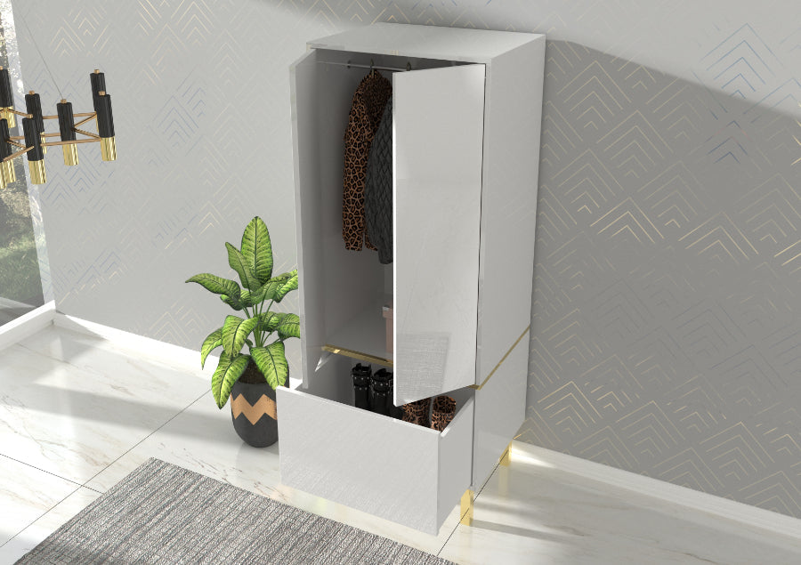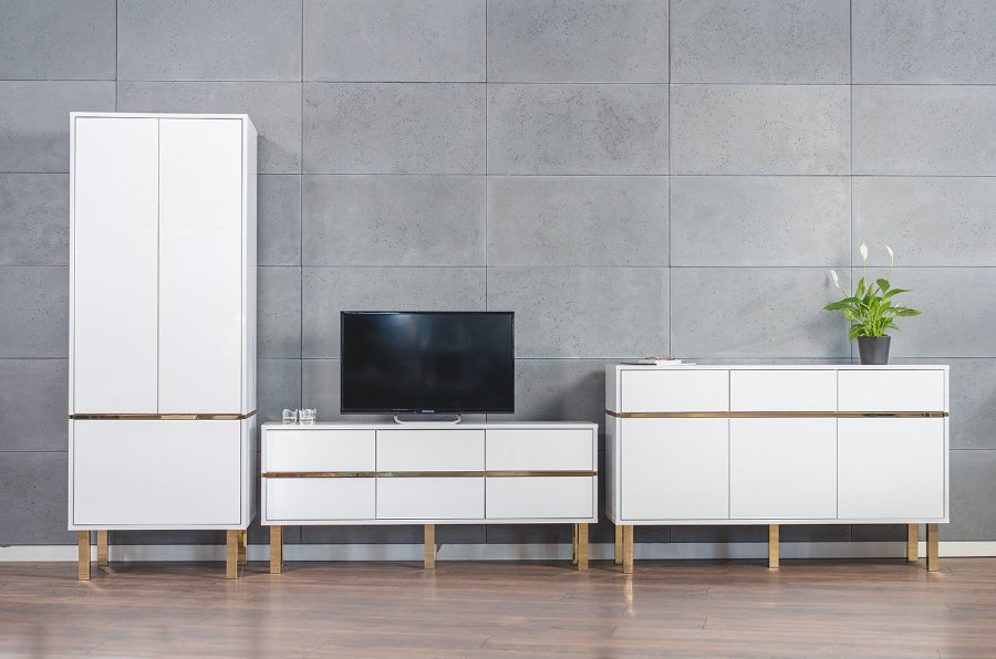 The white MAGICA wardrobe by Dancan is a piece of furniture that perfectly combines minimalism with glamour, The sparse shape is combined in this wardrobe with glossy finish and golden, but not obvious in form, accessories, The legs are straight and massive, and the element surrounding the furniture on the sides and front of a simple form (U-shaped profile), The MAGICA wardrobe breaks all conventions, Both gold accessories in a minimalist form and the use of the piece of furniture are not obvious,