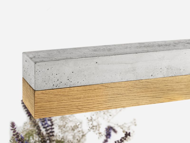 Beton brut (gri deschis sau gri închis) cu abajur din lemn de stejar.