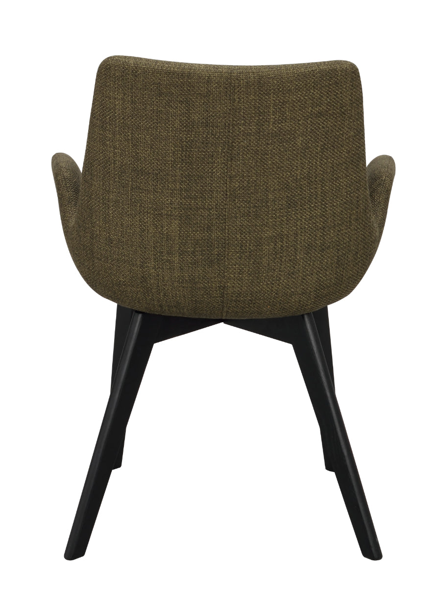 Fotoliul Drimsdale din material verde este un scaun modern și atemporal, cu cotiere înalte, care îl face confortabil să șezi.