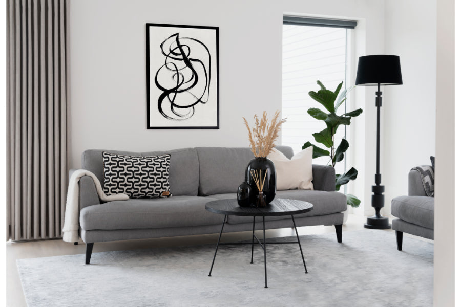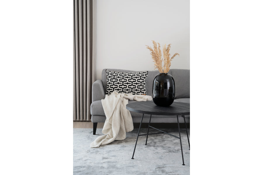 Masuta de cafea Grafton Ø70 in negru. Masa are o placă de lemn pictată ușor canelată și picioare din metal negru. Perfect pentru a fi folosit ca masuta de cafea in camera de zi.